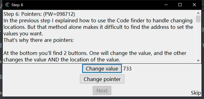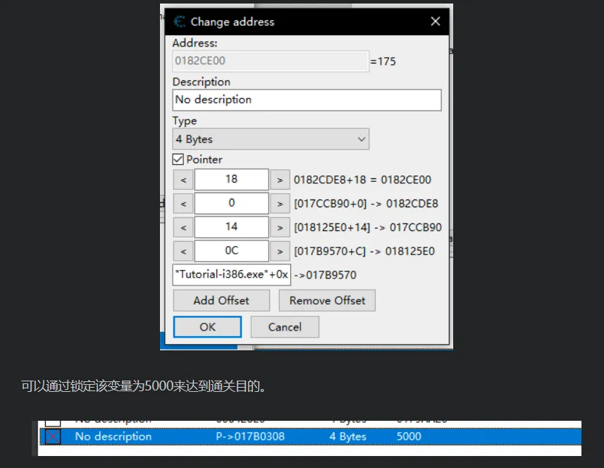 重启程序(只要能让变量所在的地址变更即可,在游戏中可选择重开地图等操作,此处我们点击Change pointer),重新寻找变量地址。