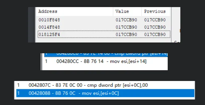 在中间有一步,会有多个不同的内存存放了同一地址,然而我们只需要一个有效的指针路径,因此我们需要手动操作这三个内存地址,分别用调试器找出哪一个地址会被程序访问到,即可得到有效的偏移量。