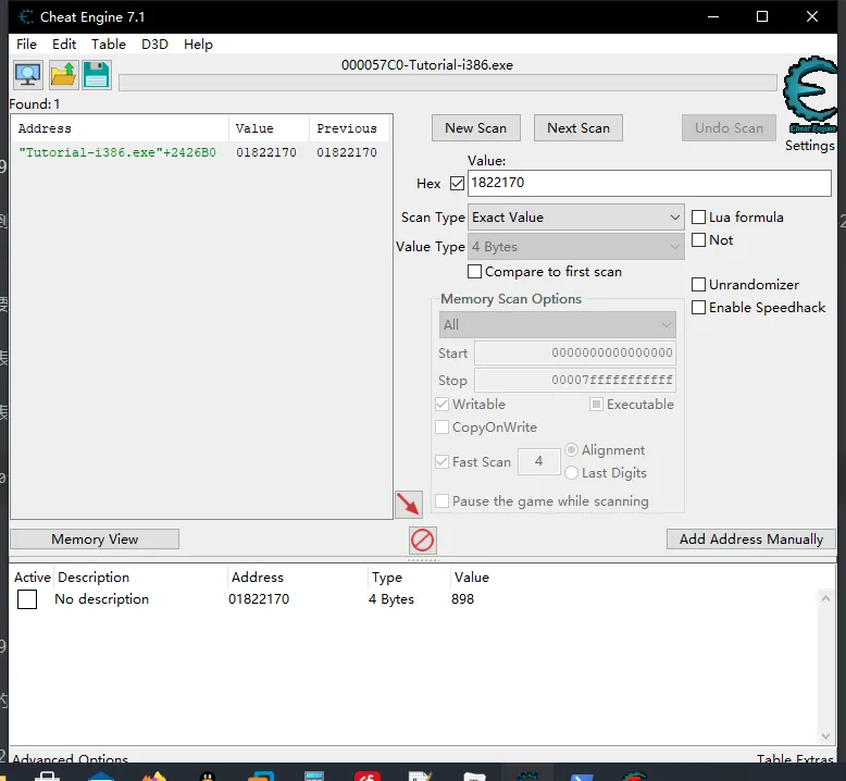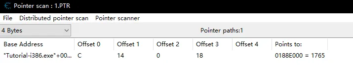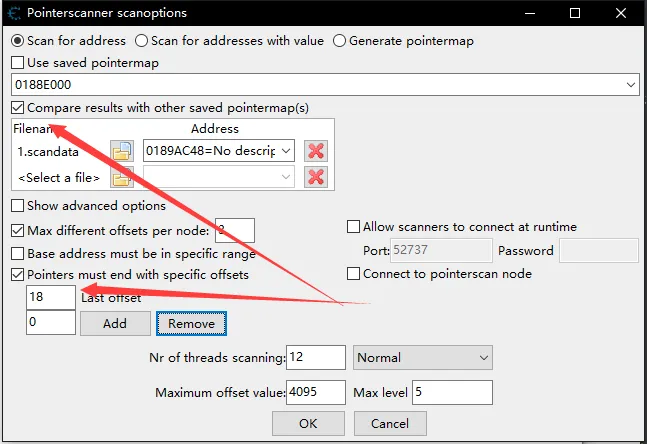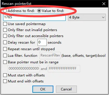 若结果有几千个甚至更多,我们可以通过右上角的Pointer scanner的Rescan选项重新扫描,可以指定目的地址或目的变量的值,从而剔除无效的指针路径。