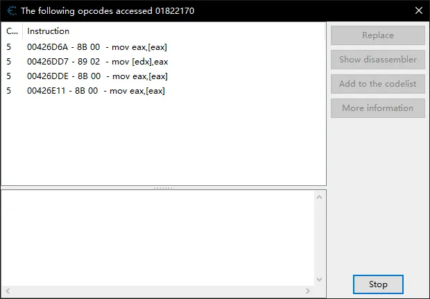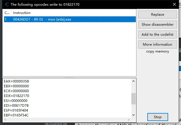 注:(个人建议)尽量不要选找到是哪个指令访问了这个地址,除非没有方法改变这个内存地址的值,否则可能会有很多指令对分析造成干扰。以下图片是该选项的结果