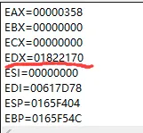 接下来我们在CE中搜索edx的值,在调试器中点击指令便会显示此时各寄存器的值,此时edx的值为0x1822170