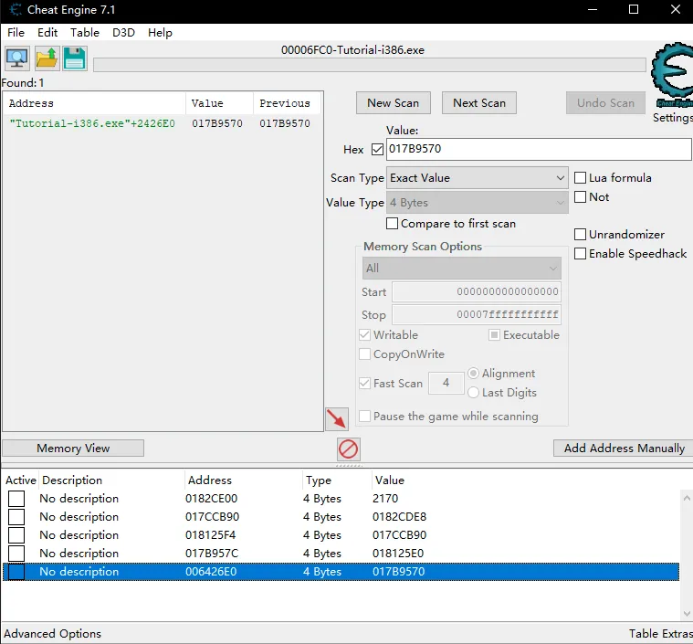 我们可以看到,搜索到的地址以exe文件名开头(在CE中用来表示基址),因此我们达到了访问目标地址最初的指针,偏移量为+2426B0,这是一个一级指针。