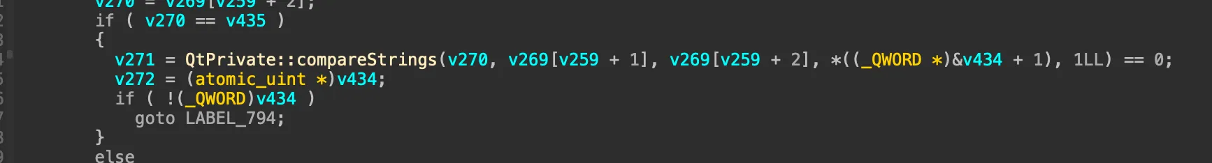 const qtstrcmpview = new NativeFunction(Module.findExportByName(qt_mod, '_ZN9QtPrivate14compareStringsE11QStringViewS0_N2Qt15CaseSensitivityE'), 'pointer', ['uint64', 'pointer', 'uint64', 'pointer', 'uint64'])