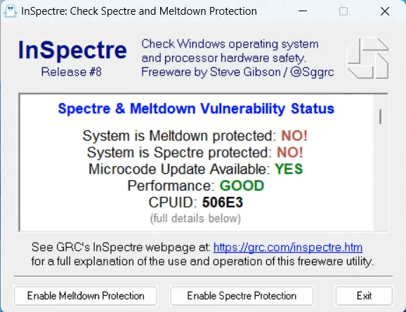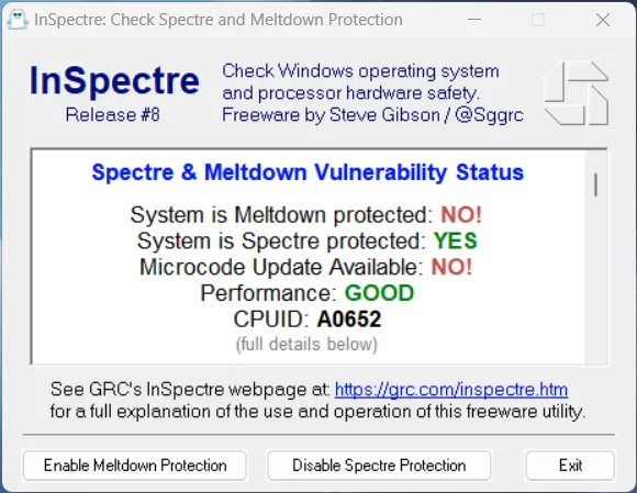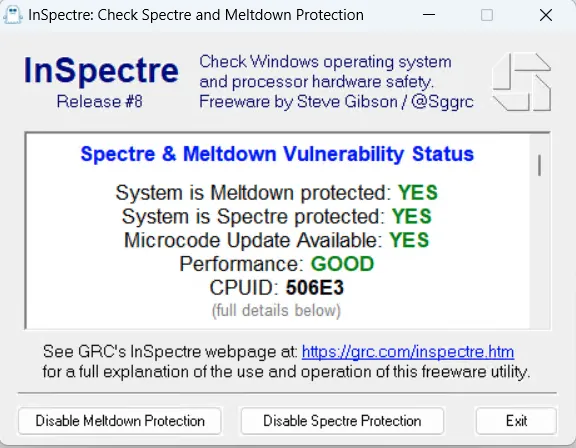 Firstly, the attack has been patched long times ago, by both OS and CPU Microcode perspective, and KPTI(also known as KAISER) has been introduced to most systems, here is an example for linux kernel. So we needs to disable these security features first to achieve the attack. Here we need a freeware named InSpectre, and most importantly, we need a vulnerable processor.