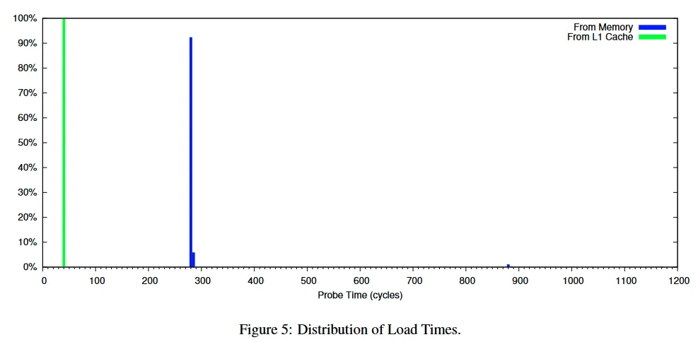 Even if a memory location is only accessed during out-of-order execution, it remains cached. Iterating over the 256 pages of probe array shows one cache hit, exactly on the page that was accessed during the outof-order execution.
